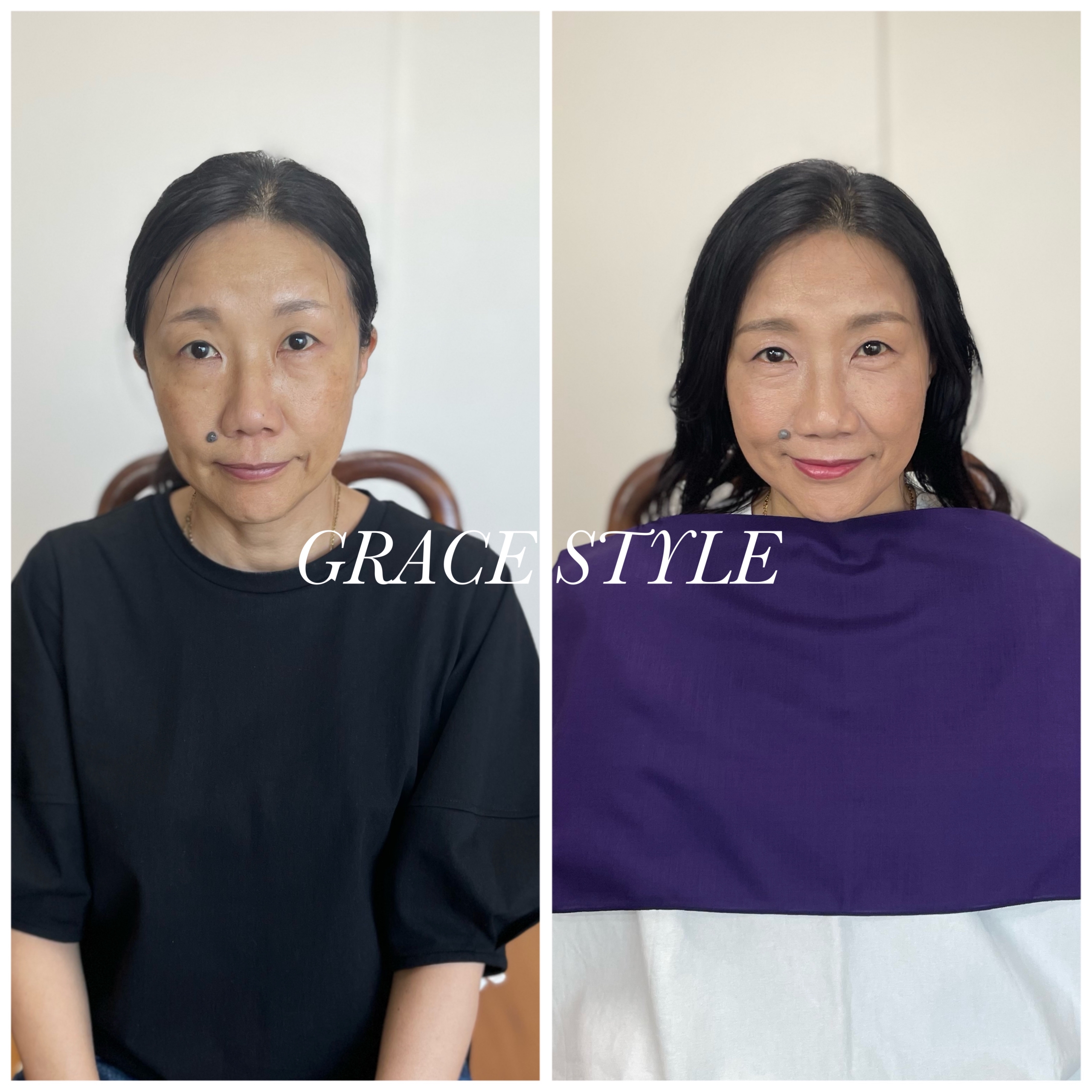 また、パーソナルカラーのメイクアイテムでフルメイクレッスンを一緒に練習した結果、お顔の透明感も増して、全体的にスッキリとした印象になられました。