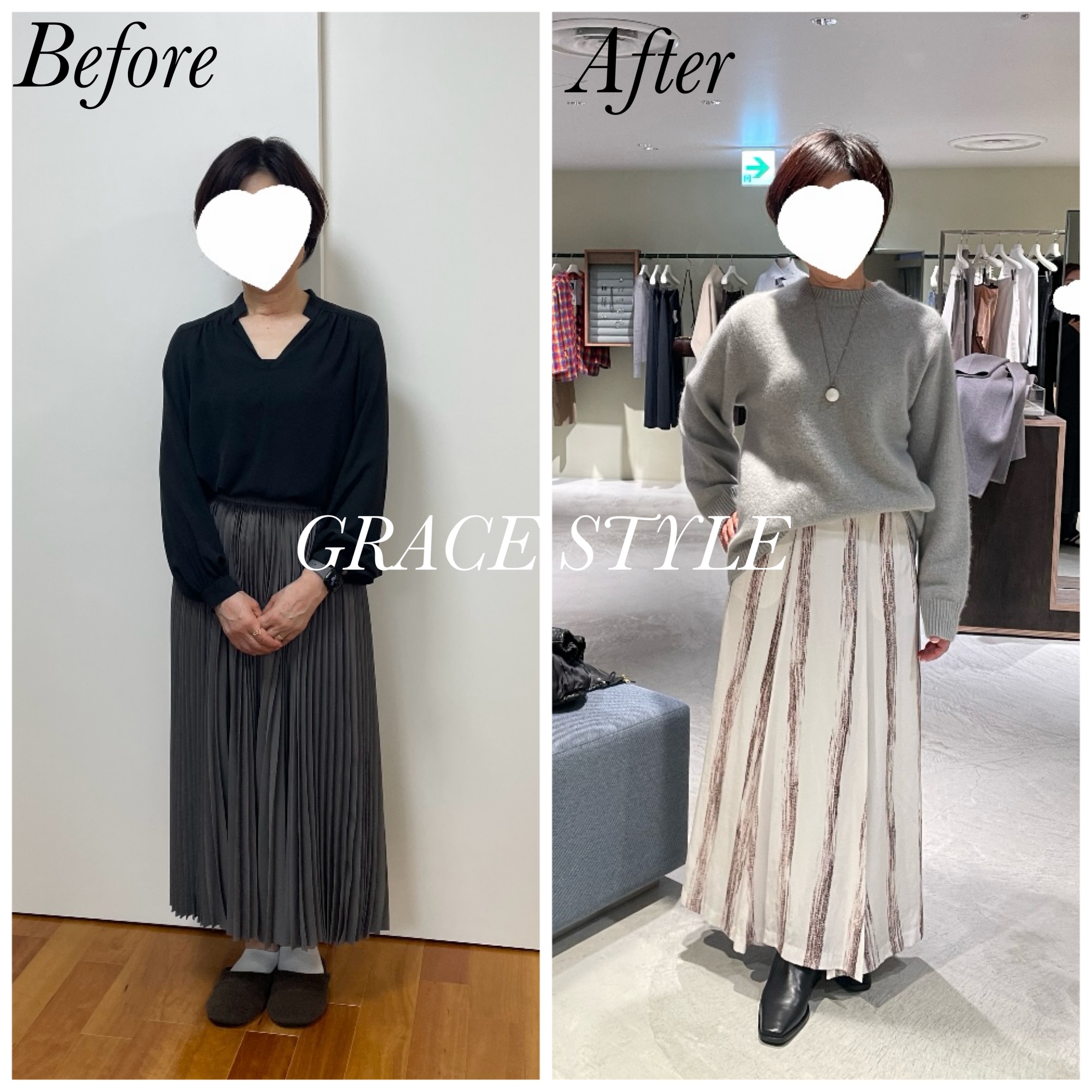 当日の2時間の同行ショッピングは、事前に下見をしておいたどちらのアイテムも良くお似合いで、お写真を撮る際に、笑顔でポージングも決めてくださり本当に楽しい時間でした。